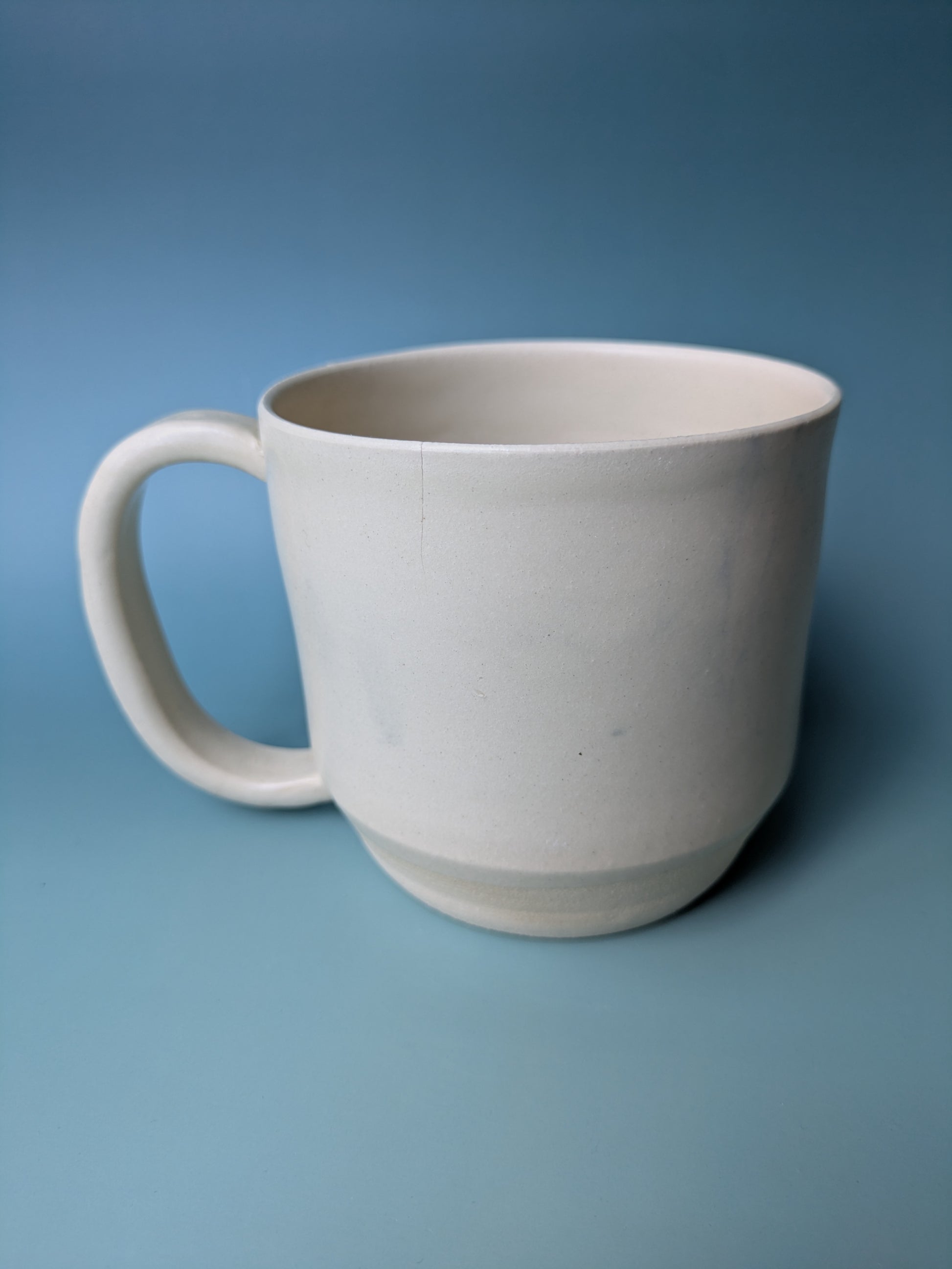 This mug is wheel-thrown and features a handcrafted stylish function-forward 4 finger handle. It is made from midfire white clay body with a cream glaze. It is dishwasher safe, and designed for daily use.