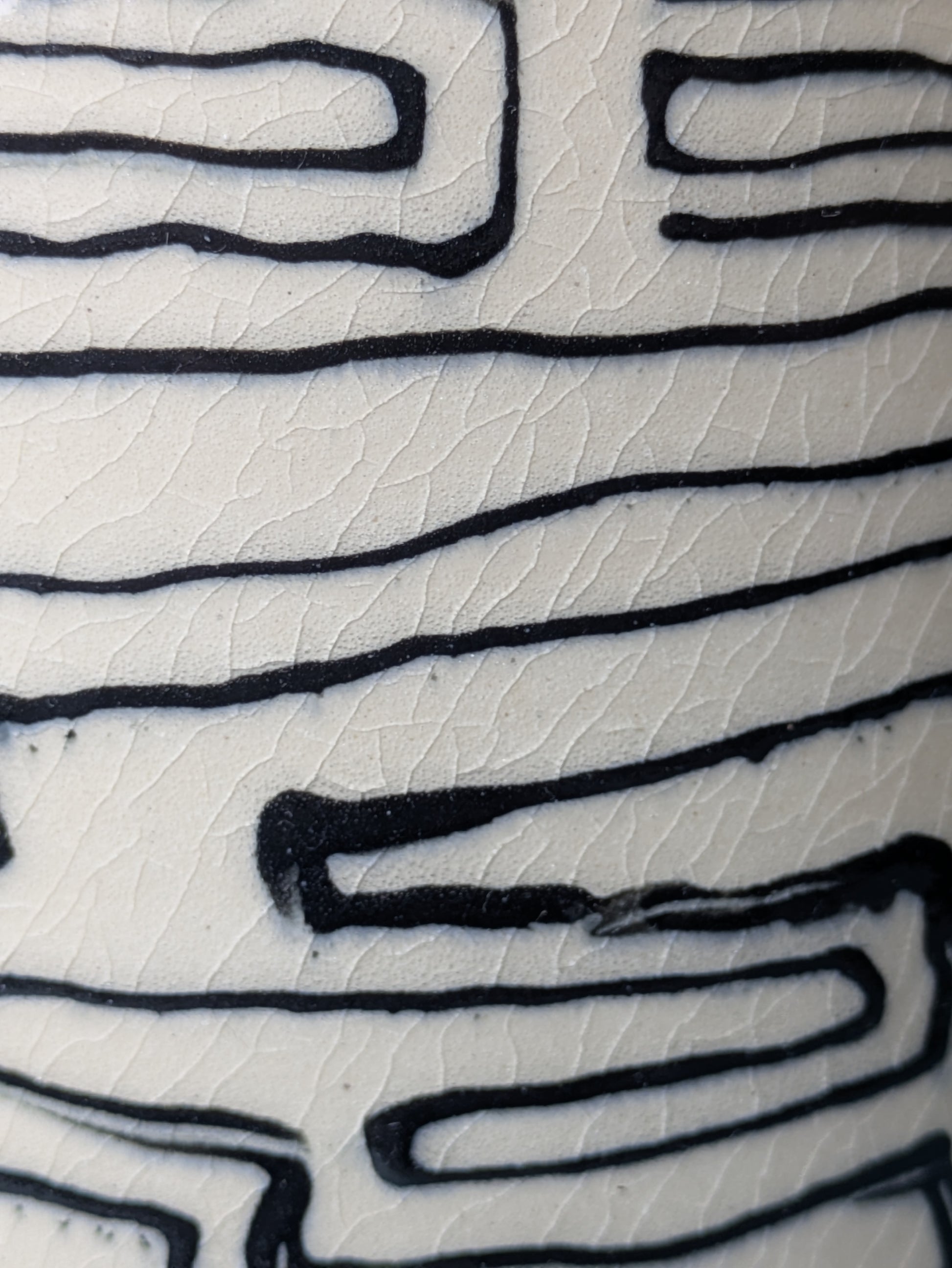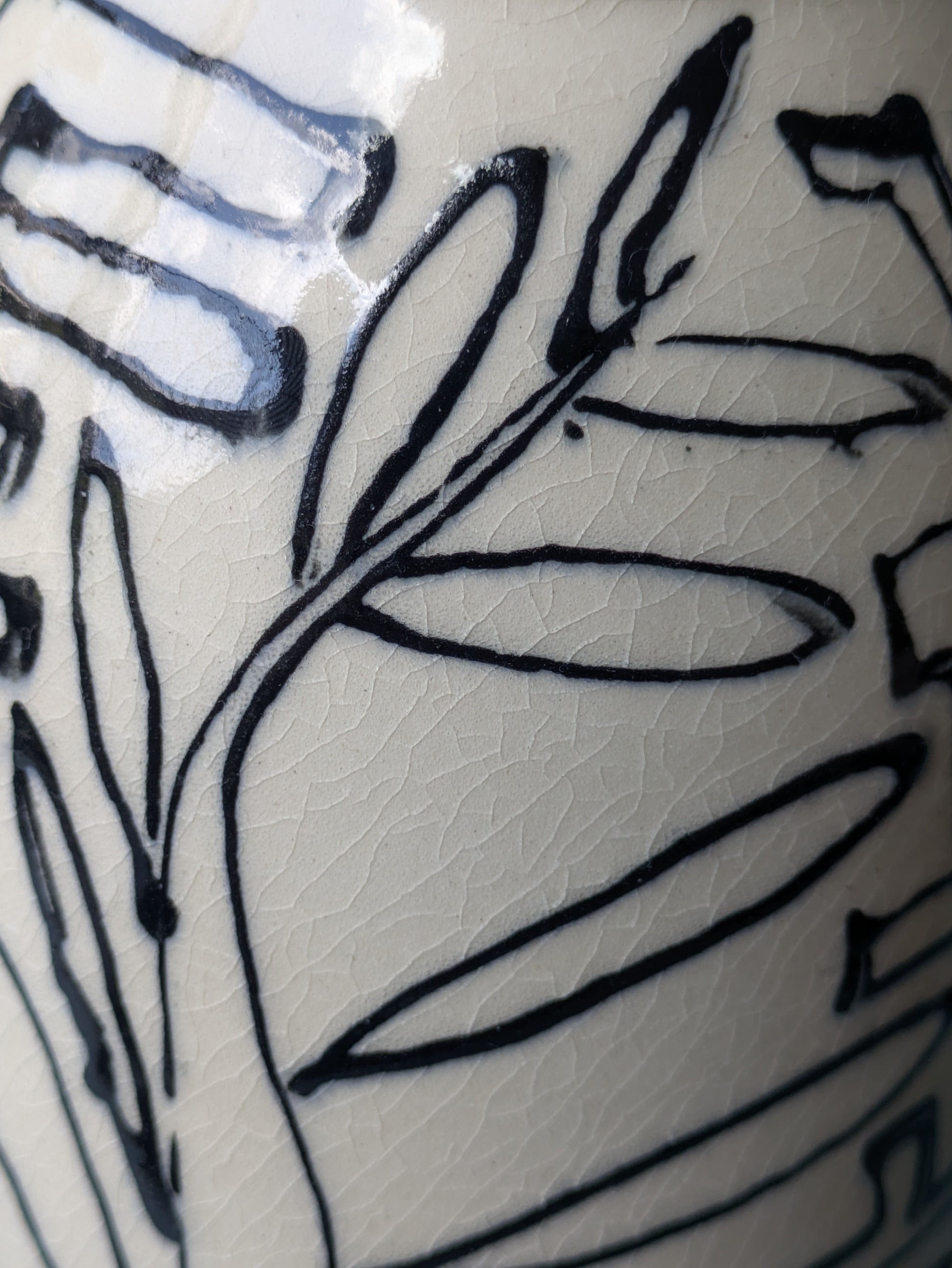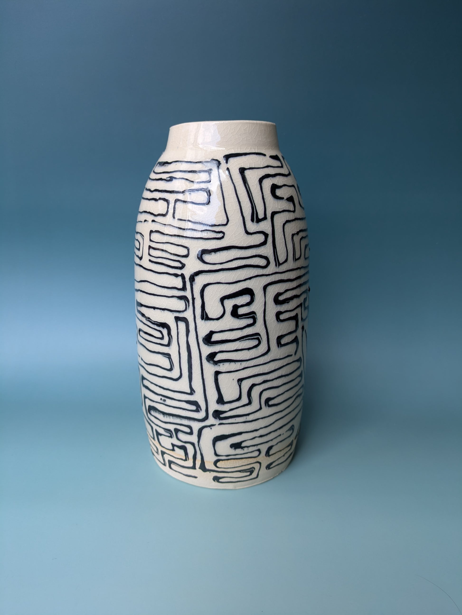 This vessel is expertly wheel-thrown from midfire white clay and finished with a clear glaze. The design is hand painted in black slip underglaze.